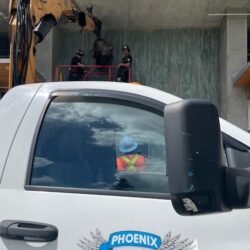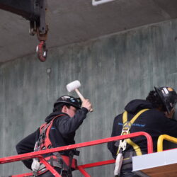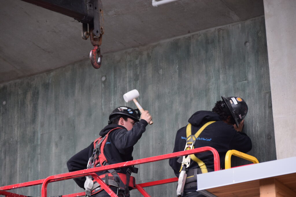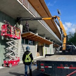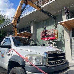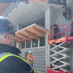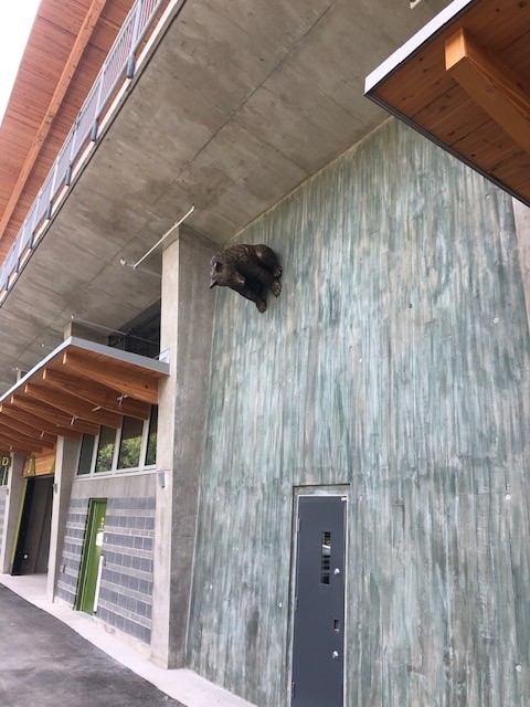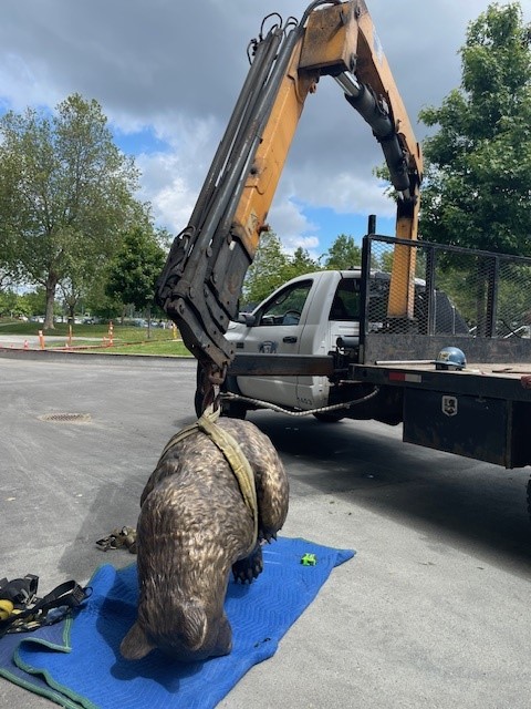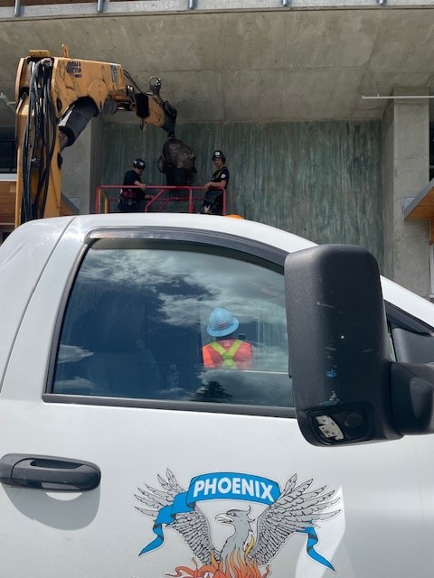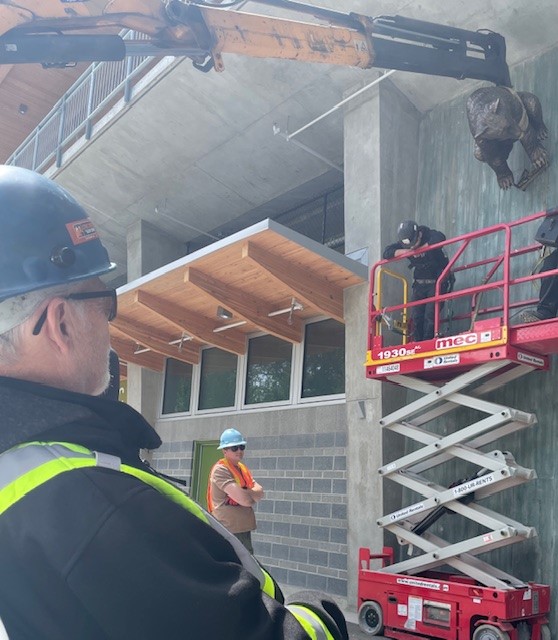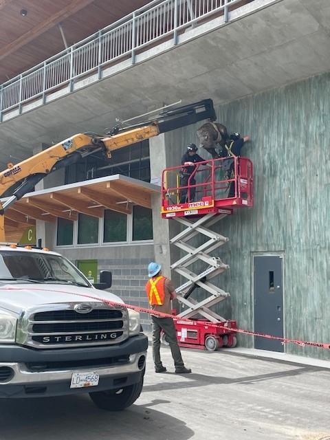 As always, this project involved craning to carefully and precisely place five of Brandon’s stunning bronze pieces on the outside wall of the new stadium at Bear Creek Park, one of Surrey’s 800 vibrant parks. The sunny day and lively atmosphere of the park, highlighted by the presence of small school children playing all day in the playground and utilizing the park in its fullest, added to our delight. The Surrey tourism association, present with a booth, informed us about the park’s extensive offerings. Let’s just say that being there all day was not a hardship. Meeting Brandon and understanding his artistic vision was also an enriching experience that made this installation truly special.