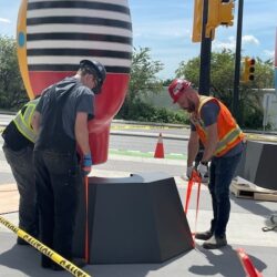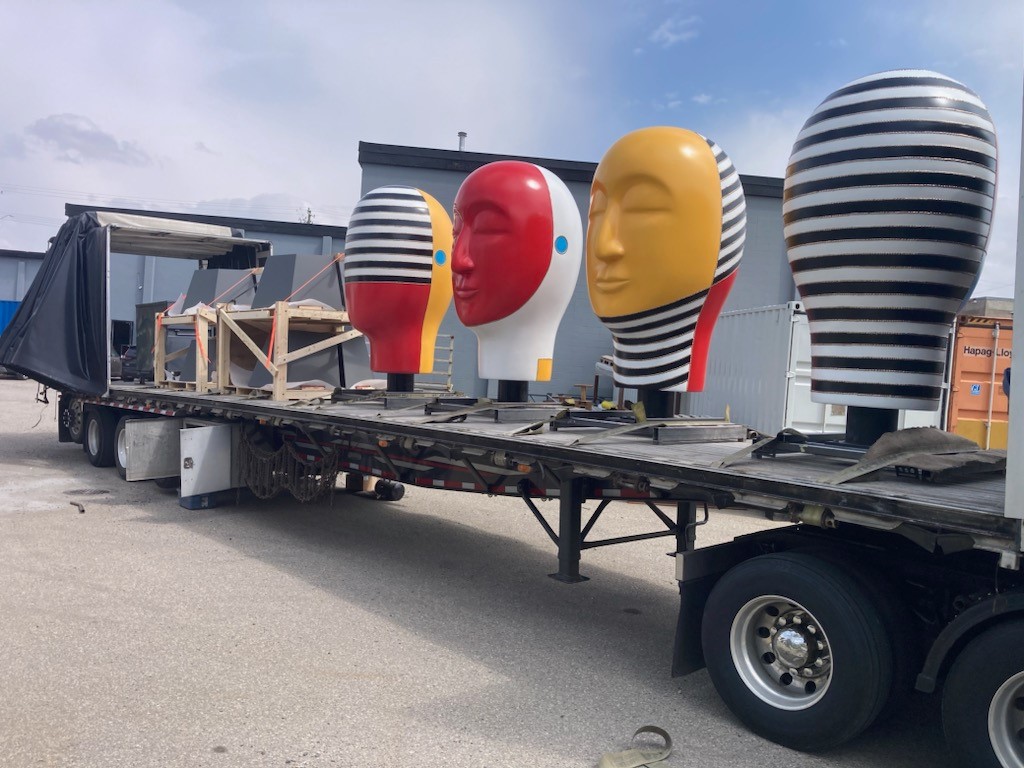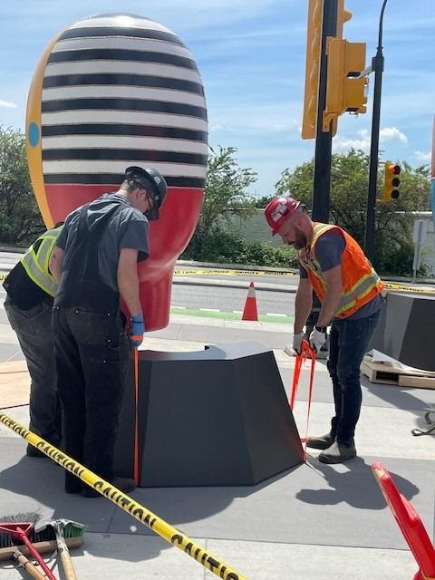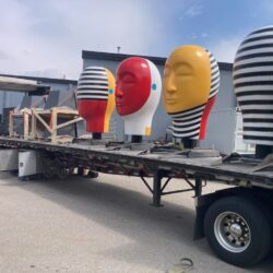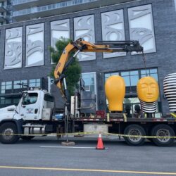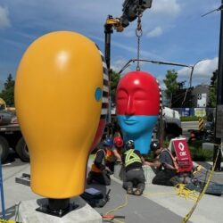The thorough planning and execution behind the installation are commendable. Spearheaded by the talented team at Carvel Creative, every detail was carefully considered to ensure a seamless integration into the urban landscape. A special acknowledgment goes to their install team, whose expertise and diligence was instrumental in the project’s success. Their meticulous approach ensured that each head was securely anchored and perfectly positioned, without any disruptions to the surrounding environment. Their foresight to add hooks at the top of each head, facilitated the installation process, making it a breeze for the crane operator.