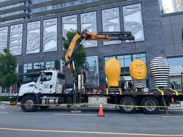 Our crane operator Chris was professional and worked with confidence, during the transportation and installation of these sculptures, which originated from Calgary, and were stored briefly at our facility in Port Coquitlam. Handling such tasks is no easy feat, particularly considering the significant value of each piece. Chris’s expertise and composure were commendable, ensuring that every sculpture was maneuvered into position with meticulous precision and care.
