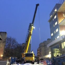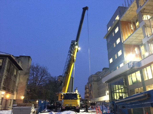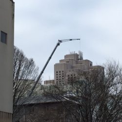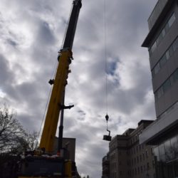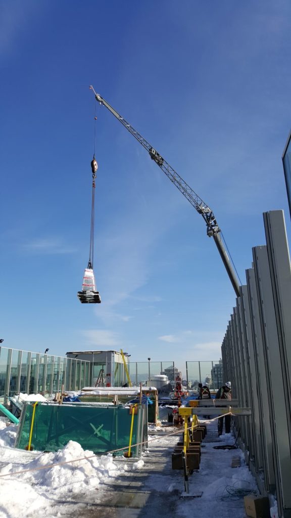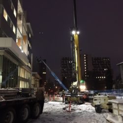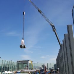Phoenix was contracted by three different customers to work on the installation of the mid and upper courtyards of this building. Using our 165 ton crane over a span of a couple weeks, the scope of work consisted of multiple lifts containing windows, soil and pavers – all used for the building of the courtyards as well as the roof. The furthest reach out was 150’, and the operator was required to set-up and reposition the crane to different locations around the building.
