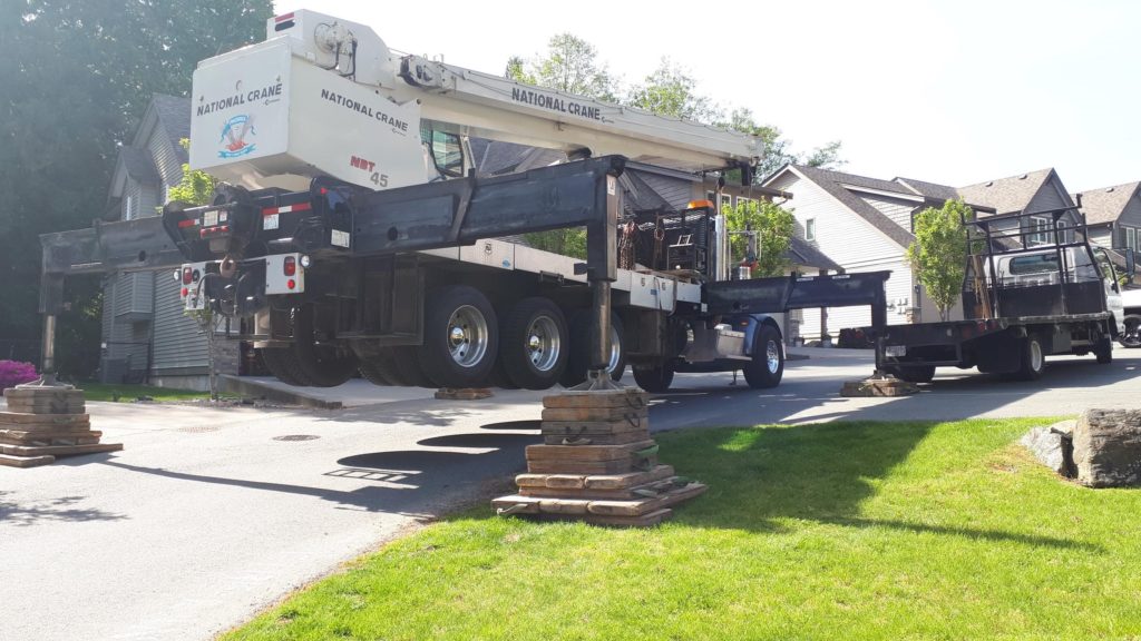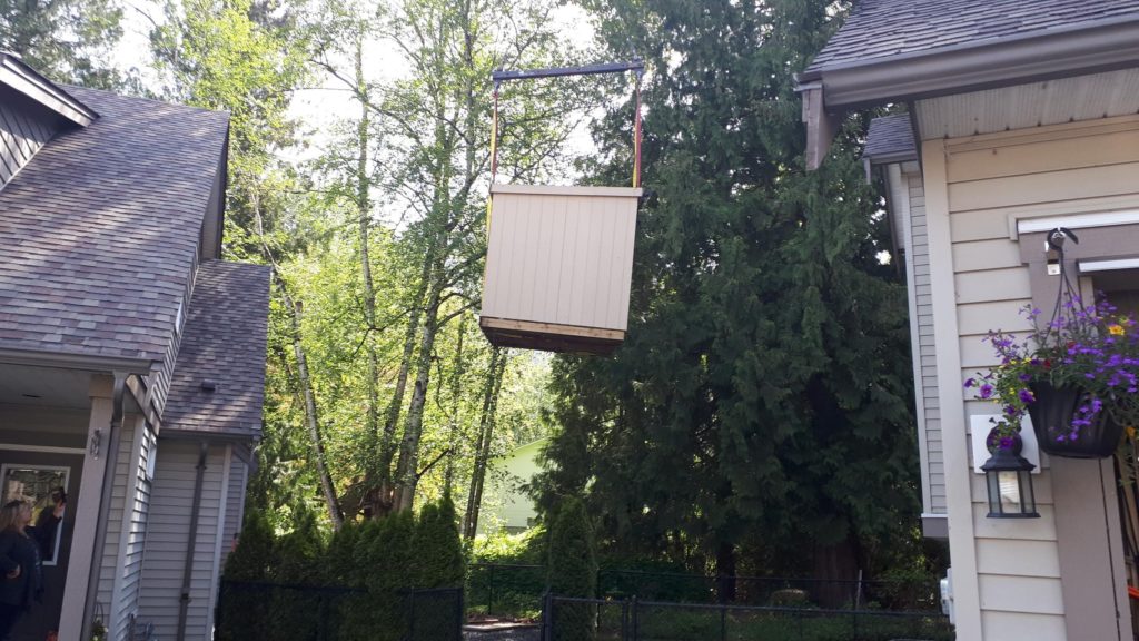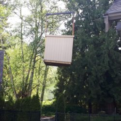 So when a customer asked us to relocate the beautiful ‘home’ of her working dog, we all got very excited! These dog kennels are not your typical kind of dog bed though, and in this case the piece to hoist, transport and place at the owner’s new property was 8’ X 12’ X 8.4’ with a total weight of 1,000 pounds. The placement needed at least 85 feet of boom to reach the other side of the property, making our crane choice pretty simple, unit #5050 was the perfect fit for the job.
