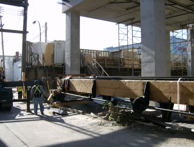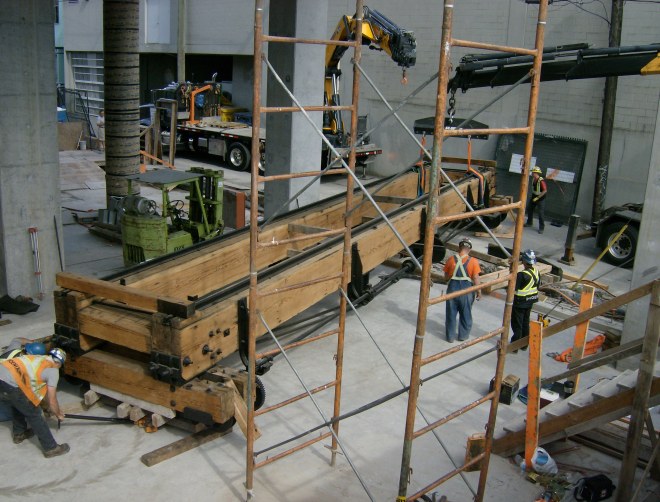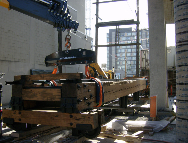 Bastion Developments hired Phoenix for two main projects: reclaiming and installing lumber, and salvaging a wooden Gantry Crane from the original building. Lumber was reclaimed from the site, then using our 60 Ton Hydraulic Crane, our operator installed upright beams and roof trusses.