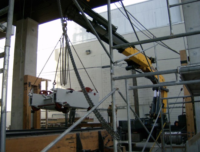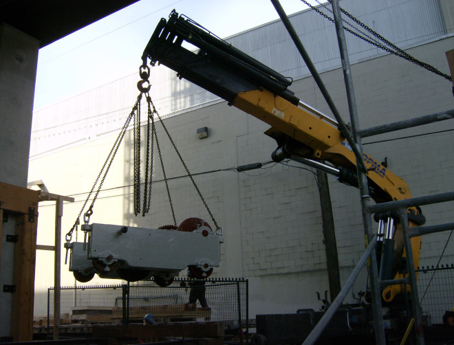 Using our Folding Hydraulic Cranes in tandem lifts, alongside an industrial moving crew, the gantry crane was transported and installed inside the building. The gantry crane is 40’ long x 10’ wide.