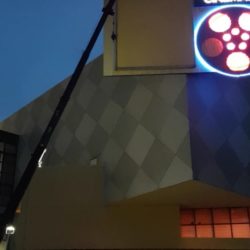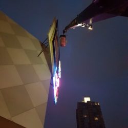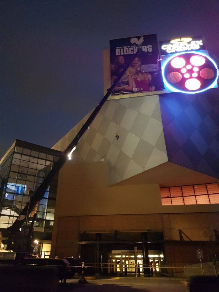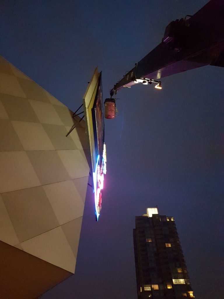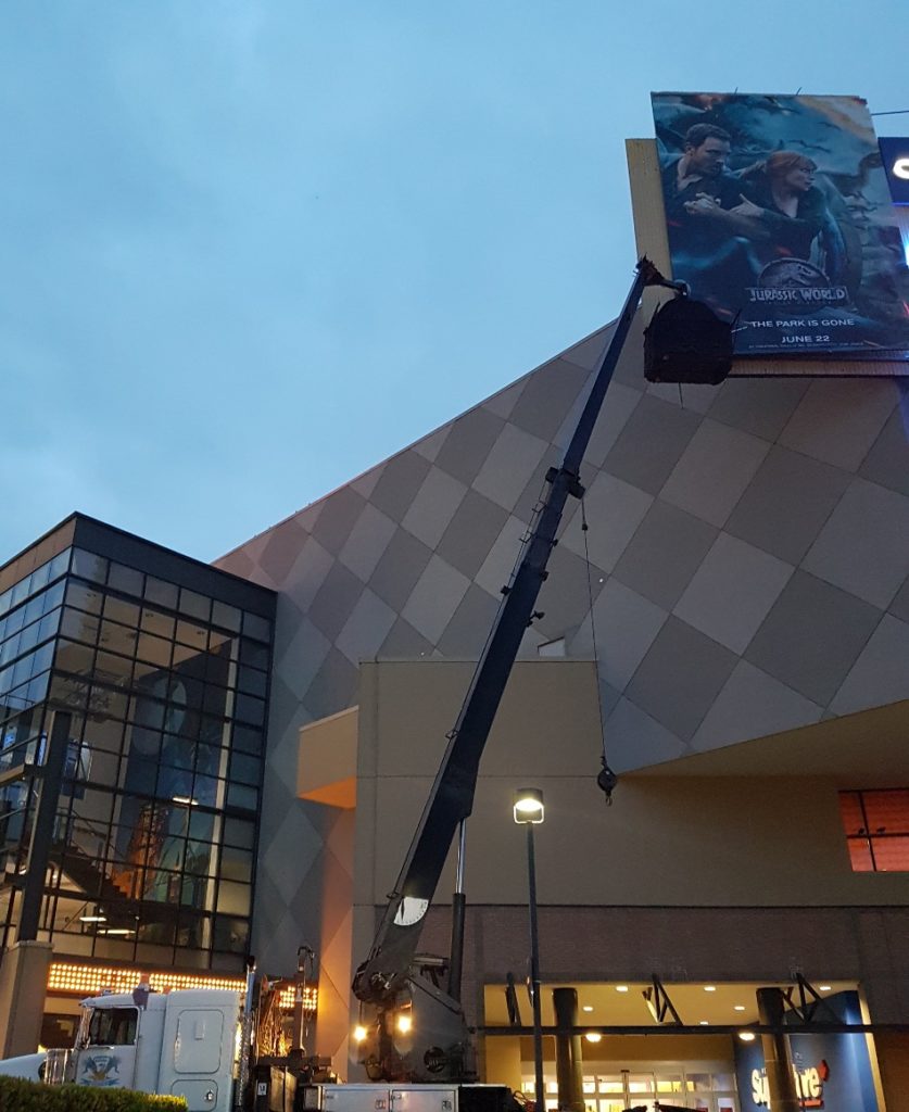 Jib on, our 30ton stiff boom lifted our 2-man hanging basket to the top of the billboard to reveal the latest Jurassic World movie poster.