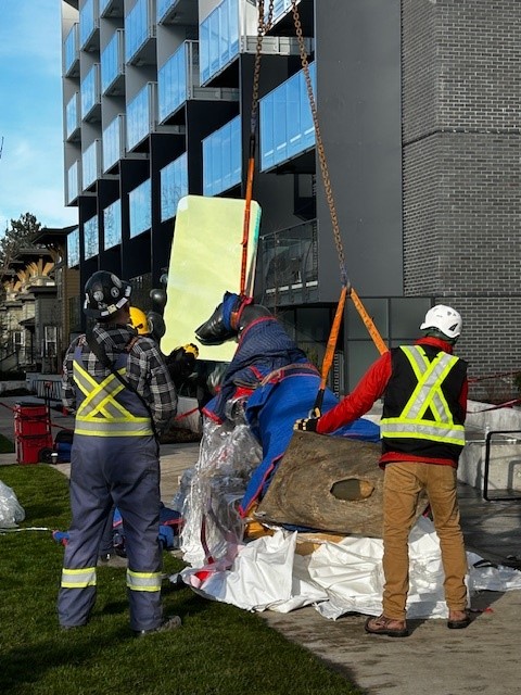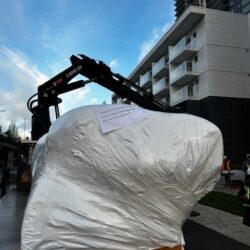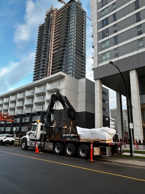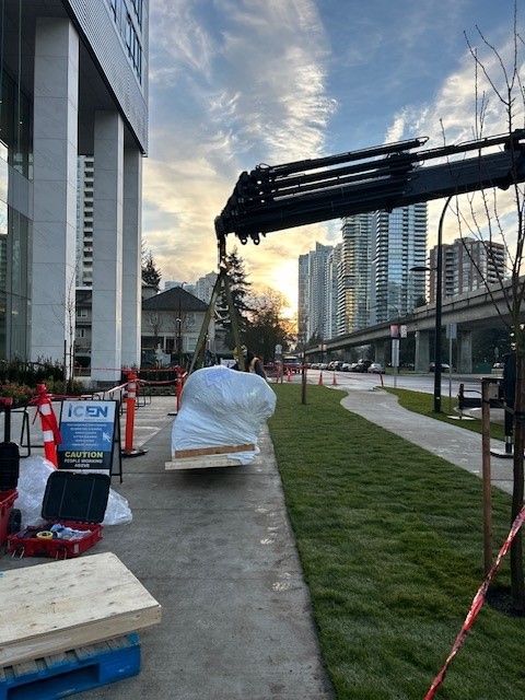 Before this piece made its way to site, it was stored safely in our warehouse. When the installation day arrived, our team transported it with the utmost care as we were moving someone’s vision. With precision planning and teamwork, we positioned the sculpture to its permanent home, the final step in a journey that began years ago. The day was topped off with a site visit by the artist, Khan Lee, who was there throughout the entire installation.