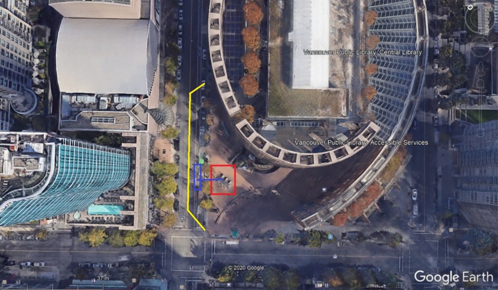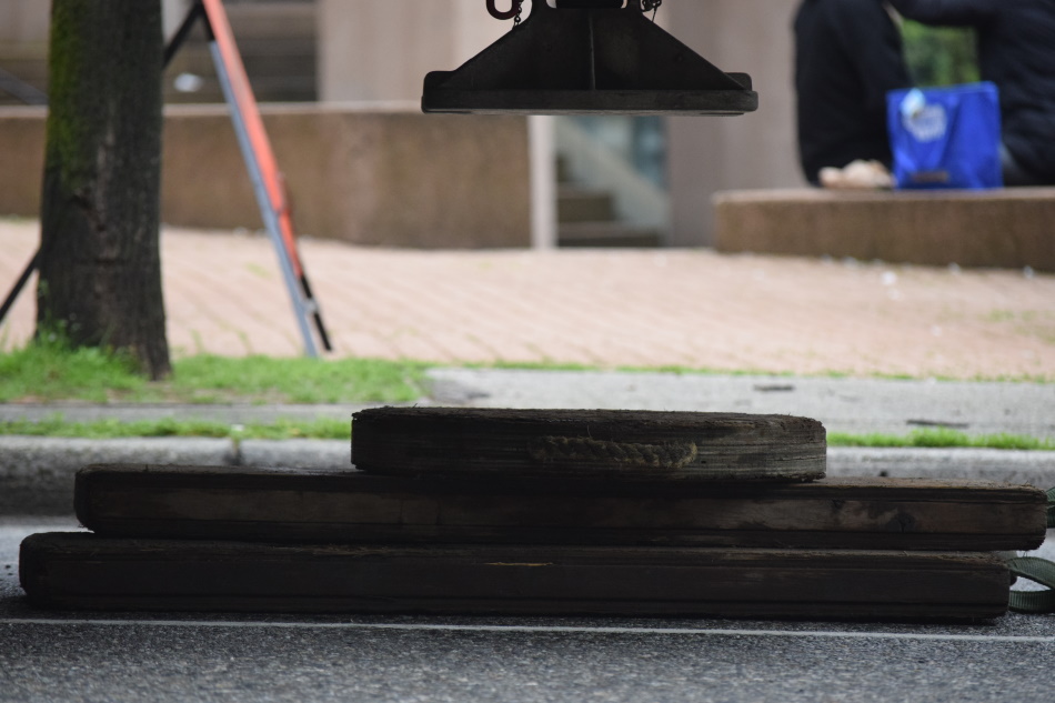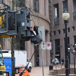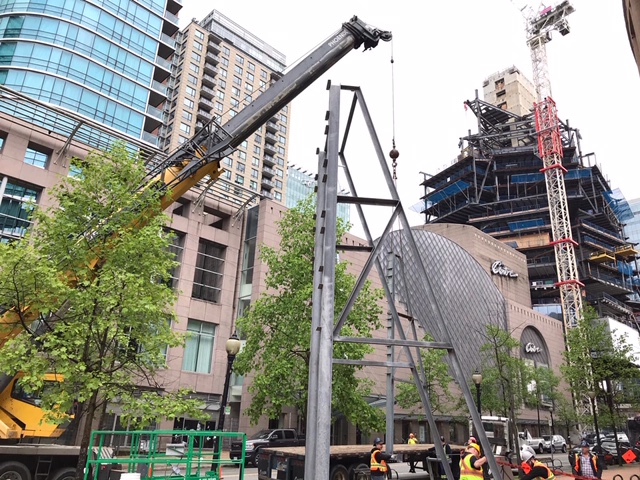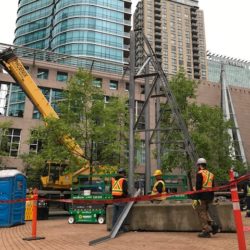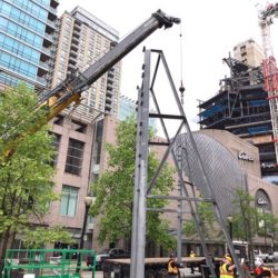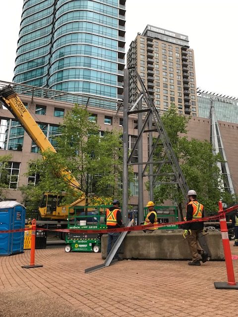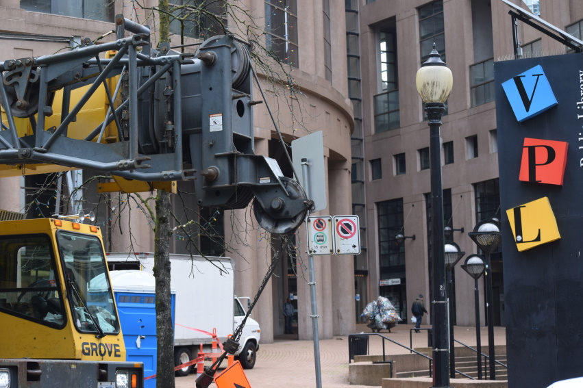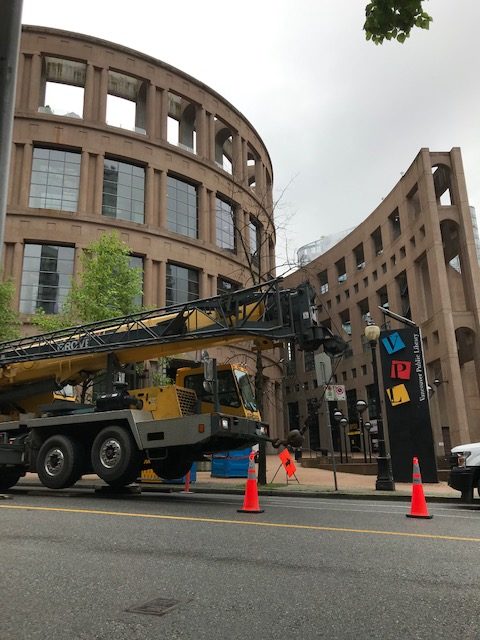 Dealing with public art is always very interesting work for our team. While usually we handle the install of these pieces, such as the giant panda bears at the Parq Vancouver Casino or the Spinning Chandelier under the Granville Street Bridge, last month we were hired to handle the removal of a piece at the Vancouver Public Library.