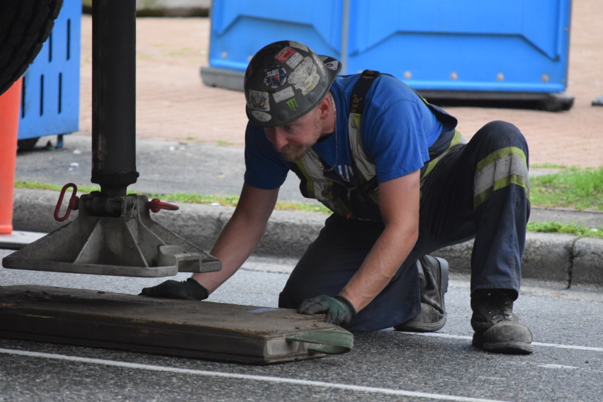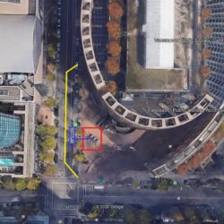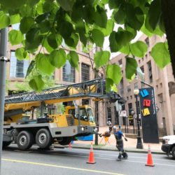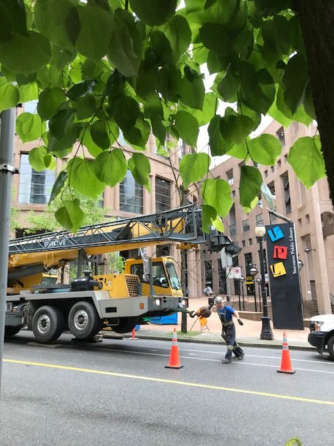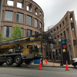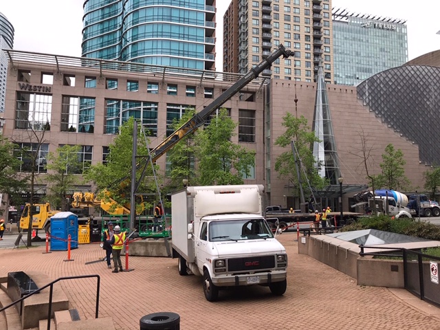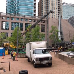With the crane facing South and delivery truck facing North on Homer Street, the piece was dismantled delicately by our unit #6060 working at 40’ radius. It only took a few hours for this fixture of the Vancouver landscape to be taken away, now leaving space for some planned renovations of the plaza.