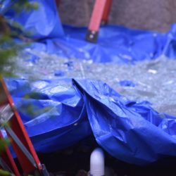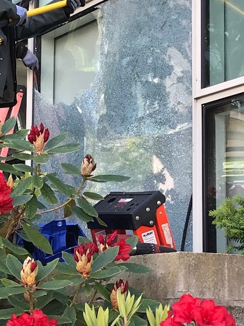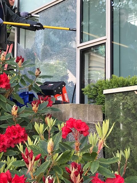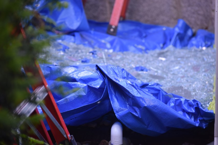 Before they began, they made sure that everyone and everything was safe by wearing PPE and protective clothing, as well as laying down a drop cloth to avoid any small pieces of glass that may fall.